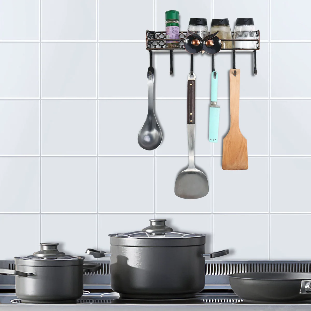New Multifunctional Wall Mounted Owl Spice Shelf with Hooks Iron Spice Rack Space Saving Storage Or